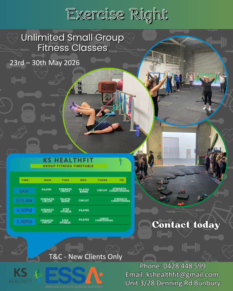 Based in the coastal city of Bunbury, Western Australia, KS Healthfit are your go-to for Group Fitness, Personal Training, Exercise Physiology, Age Well Seniors Fitness & Able Fitness Classes.